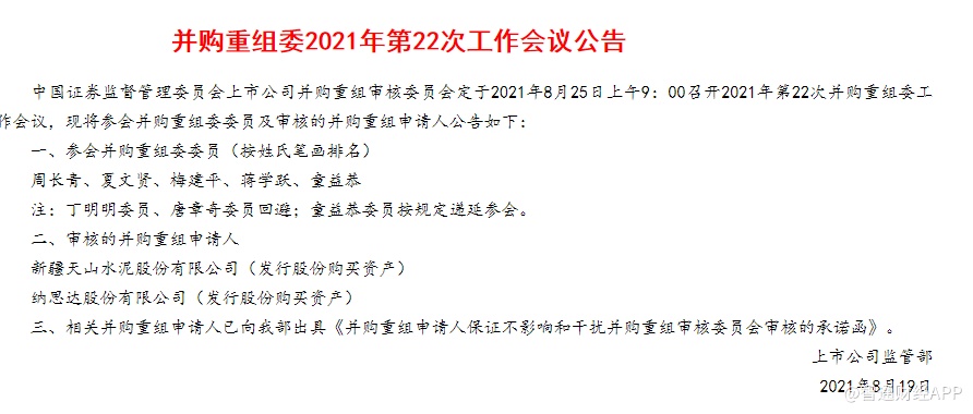 智通财经APP获悉,8月19日,证监会公告,新疆天山水泥股份有限公司、纳思达股份有限公司发行股份购买资产事项8月25日上会。