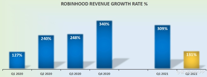 2020年Robinhood收入增长率高于150%,而2021年第二季度则低于这一收入增长率。此外,Robinhood还表示Q3或无法再实现这样的高增长。