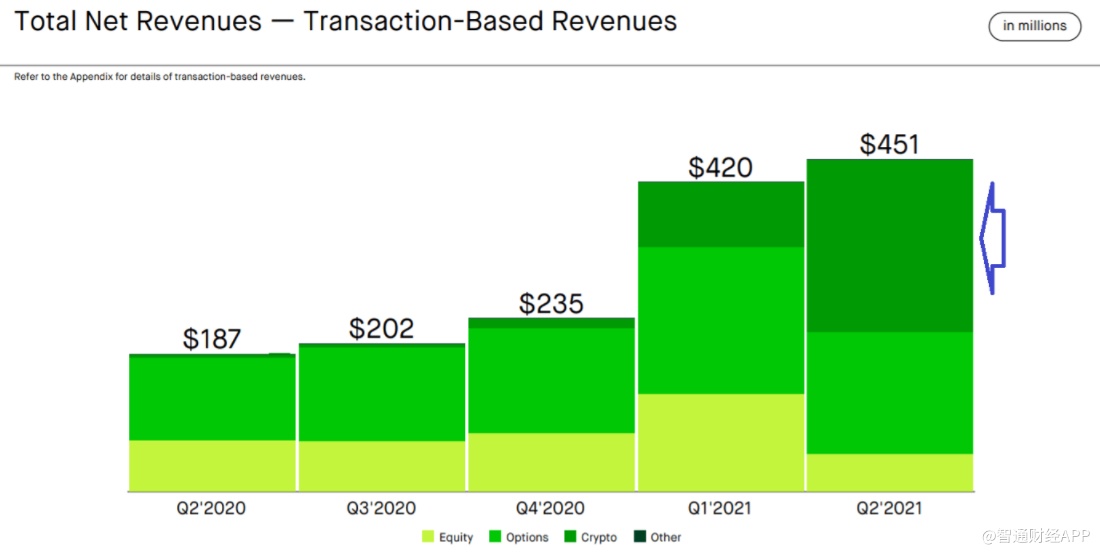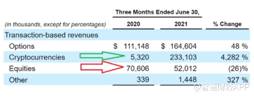 如上图所示,2021年第二季度的营收大幅增长来自加密货币交易。事实上,Robinhood指出,在2021年第二季度,交易加密货币的客户超过了交易股票的客户。