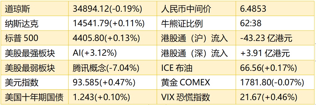1、隔夜美股截至收盘,道指跌66.57点或0.19%,报34894.12点;纳指涨15.87点或0.11%,报14541.79点;标普500指数涨5.53点或0.13%,报4405.80点。港股ADR指数下跌,按比例计算,收报25211点,下跌104.52点或0.41%。