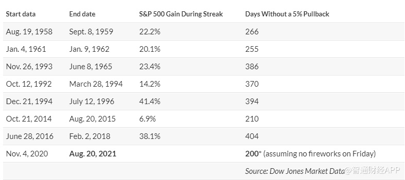 MarketWatch市场编辑Mark DeCambre指出,市场经历如此漫长的繁荣时期极为罕见。事实上,标普500指数在长时间里没有出现5%或以上回调的情况只发生过8次。