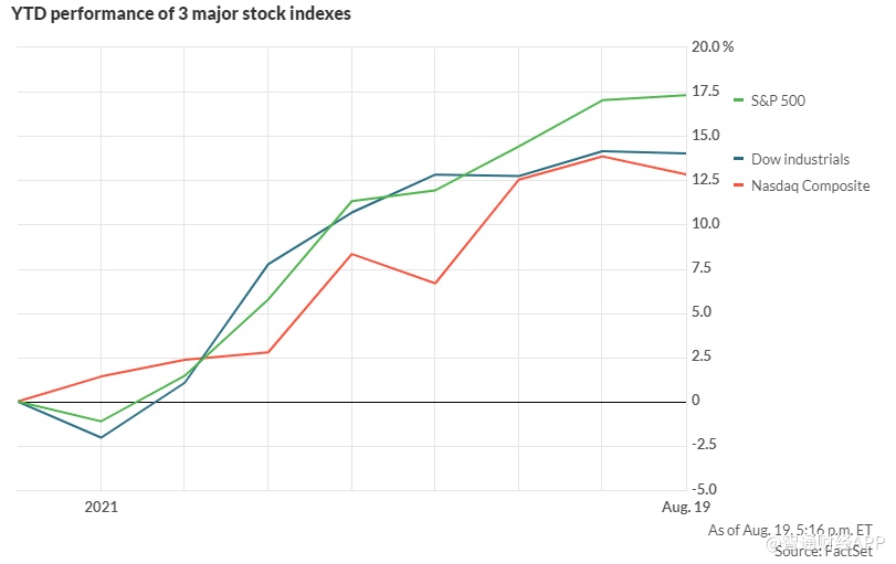 周一的买盘帮助道琼斯工业平均指数和准普500指数分别创下2021年第35和第49个历史收盘新高。与此同时,纳斯达克综合指数略高于8月5日创下的历史高点。
