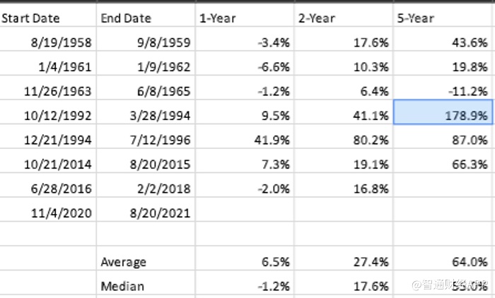 从中位数来看,市场在繁荣期结束的次年将下跌1.2%,但两年内将上涨17.6%,随后的5年上涨55%。从均值来看,平均回报率较高,分别上涨6.5%、27.4%和64%。