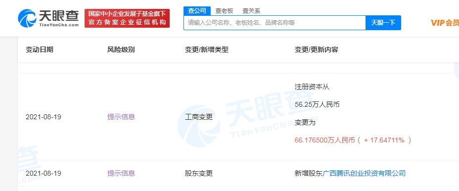 智通财经APP获悉,天眼查App显示,8月19日,成都指掌天下信息技术有限公司发生工商变更,新增股东广西腾讯创业投资有限公司,同时注册资本由56.25万人民币增加至约66.18万人民币,增幅约17.65%。据悉,官网信息显示,成都指掌天下信息技术有限公司是一家企业微信服务商。