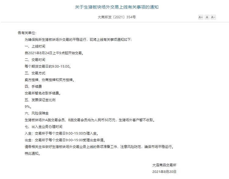 智通财经APP获悉,8月20日,大连商品交易所发布《关于生猪板块场外交易上线有关事项的通知》。通知指出,生猪板块场外交易自2021年8月24日上午9点起开始交易。据悉,场外交易的方式为卖方挂牌、协商挂牌和买方挂牌,交易所暂免收取手续费;发票保证金比例为9%。