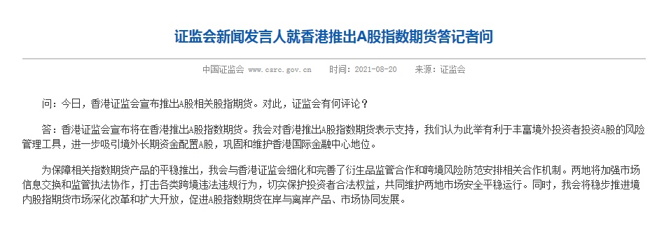智通财经APP获悉,据中国证监会20日消息,中国证监会新闻发言人就香港推出A股指数期货答记者问:中国证监会对香港推出A股指数期货表示支持,认为此举有利于丰富境外投资者投资A股的风险管理工具,进一步吸引境外长期资金配置A股,巩固和维护香港国际金融中心地位。