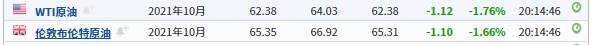 截至发稿,WTI原油跌1.76%,报62.38美元/桶。布伦特原油跌1.66%,报65.35美元/桶。
