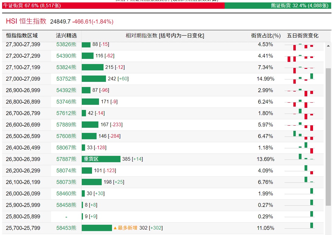 法兴恒指牛熊证街货分布图中的数据显示,熊证街货重货区在26,300-26,399区间,该区间最新熊证数量为385张,较上一交易日增加14张;最多新增在25,700-25,799区间,该区间最新熊证数量为302张,较上一交易日增加302张。