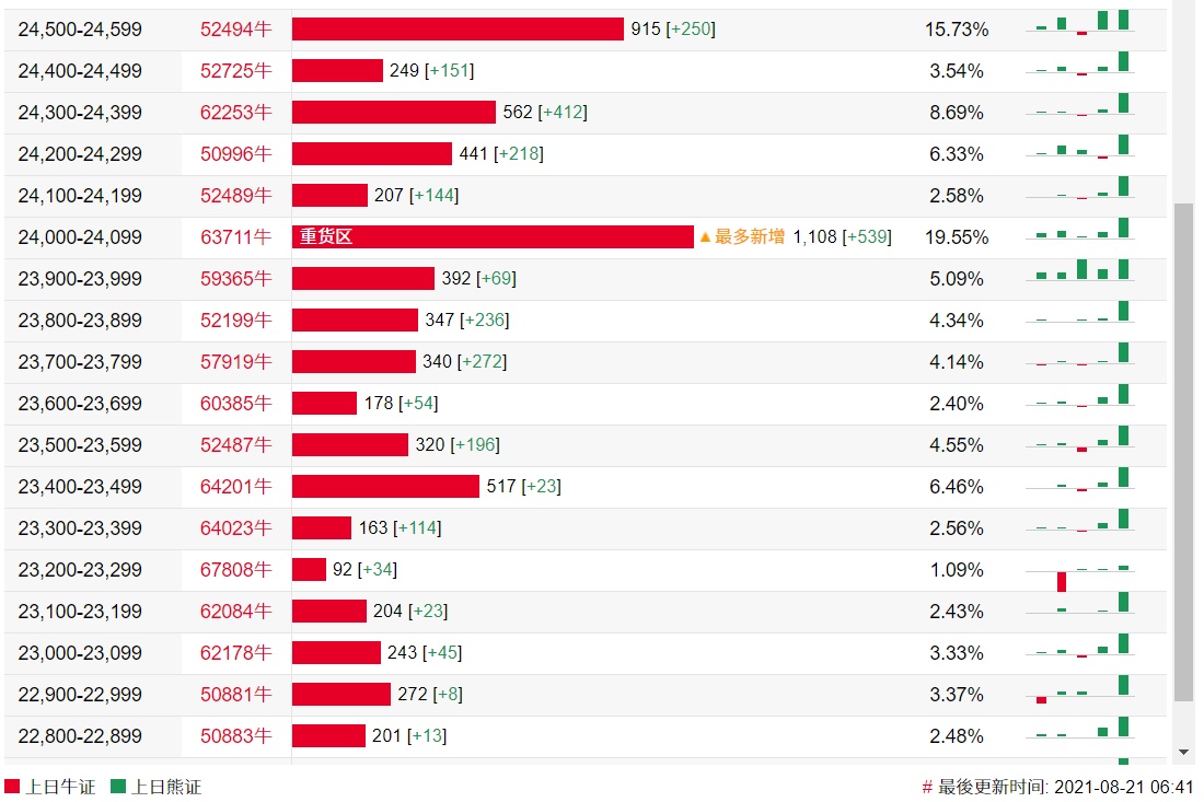牛证街货重货区在24,000-24,099区间,该区间最新牛证数量为1108张,较上一交易日减少539张;最多新增也在该区间。
