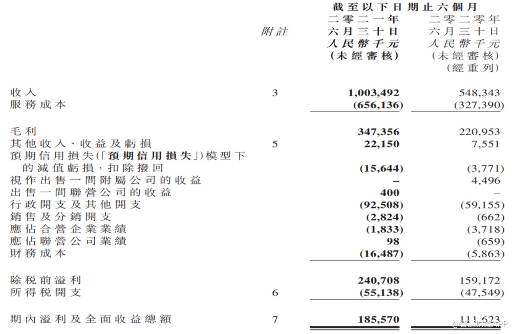 据奥园健康于8月20日发布的2021年中期业绩公告。公司于期内实现收入约10.04亿元(人民币,下同),同比增长83.0%。毛利约3.47亿元,同比增长57.2%;净利润约1.86亿元,同比增长66.3%。核心净利润为约1.79亿元,同比增长70.4%;每股基本盈利约24.49分,同比上升60.2%。