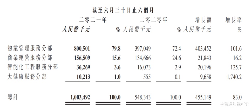财报显示,公司各项业务表现出齐头并进态势,其中物业管理服务实现营收8亿元,同比增长101.6%,商业运营服务实现收入1.57亿元,同比增长16.2%。智能化工程服务和大健康服务营收分别增长125.7%和1740.2%。