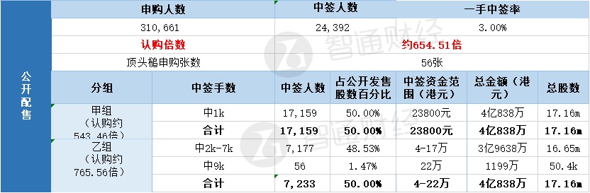 其中,公开配售申购人数310661人,一手中签率3%,认购倍数约645.51倍。