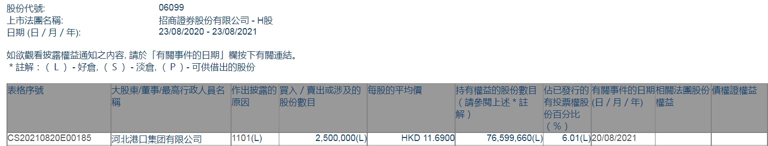 智通财经APP获悉,香港联交所最新资料显示,8月20日,河北港口集团增持招商证券(06099)250万股,每股作价11.69港元,总金额为2922.5万港元。增持后最新持股数目为7659.966万股,最新持股比例为6.01%。