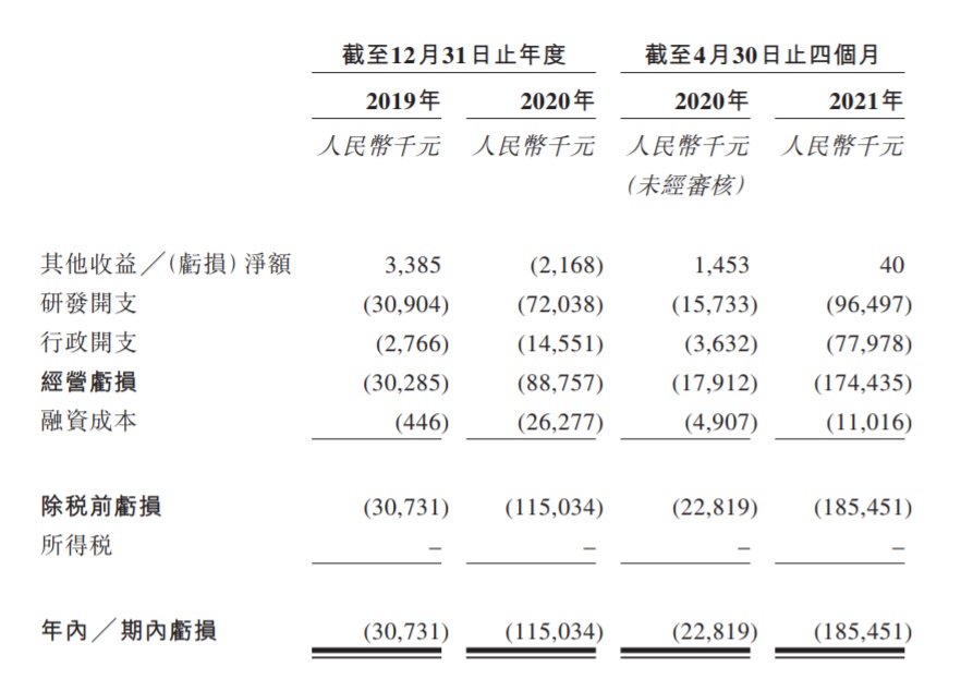 于2019年、2020年及截至2021年4月30日止四个月,公司分别产生研发开支人民币3090万元、人民币7204万元及人民币9650万元。于2019年、2020年以及截至 2021年4月30日止四个月,公司直接归属于核心产品的研发开支分别为人民币992万元、人民币2896万元及人民币1287万元。
