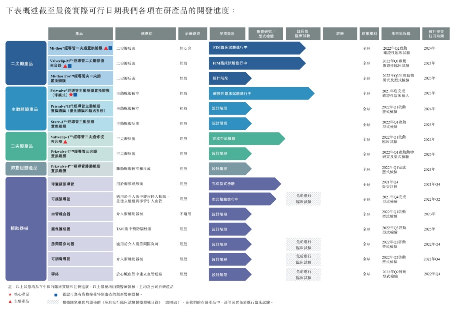 截至最后实际可行日期,公司的核心及主要产品均已取得重要进展。其中,Mi-thos®为中国第一个进入FIM临床试验的创新TMVR在研产品,Valveclip-M™为国内首款进入临床试验的创新经股TMVr在研产品之一。Prizvalve®已完成其FIM临床试验,并已经处于确证性临床试验中。Valveclip-T™已完成型式检验。公司旨在于2022年第一季度取得临床试验批准。