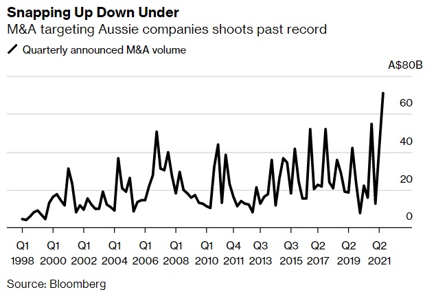 相关数据显示,在今年已经过去了近三分之二的时间里,针对澳大利亚资产的交易规模已达近900亿美元,2021年可能轻松超越2015年930亿美元的纪录。