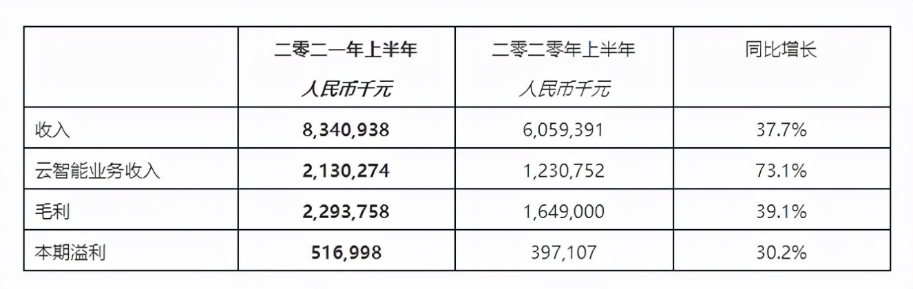 2021年上半年度,公司业务快速增长,收入同比增长37.7%,其中云智能业务收入同比大增73.1%;毛利同比增长39.1%,本期溢利同比增长30.2%。