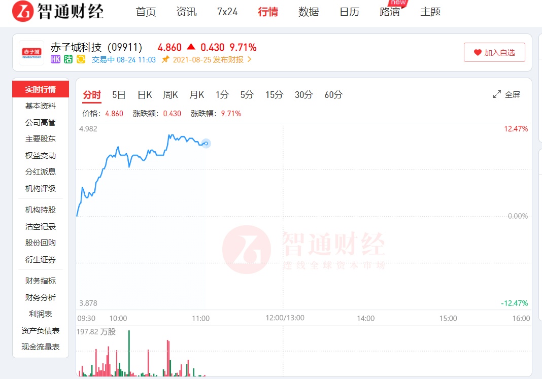 智通财经APP获悉,赤子城科技(09911)早盘一度涨超11%,截至发稿,报4.86港元。前一日,西牛证券发布研究报告,首次覆盖赤子城科技,给予“强烈买入”评级(指未来12个月绝对增长超过50%),目标价为8.39港元。