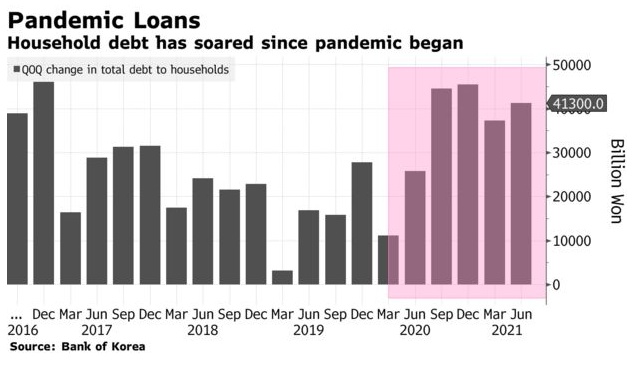 不断增长的债务加剧了韩国央行的担忧,即金融失衡正以可能危及经济的速度加剧,即使在韩国从疫情中复苏。 由于韩国政府措施未能控制家庭债务,监管机构正指望韩国央行抑制房价飙升背后的借贷狂潮。