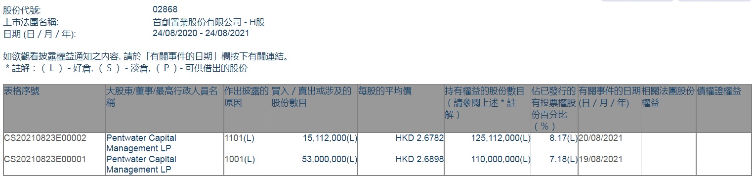 智通财经APP获悉,香港联交所最新资料显示,8月19-20日,Pentwater Capital Management LP分别增持首创置业(02868)5300万股、1511.2万股,每股作价分别为2.6898港元、2.6782港元,总金额约为1.83亿港元。增持后最新持股数目约为1.25亿股,最新持股比例为8.17%。