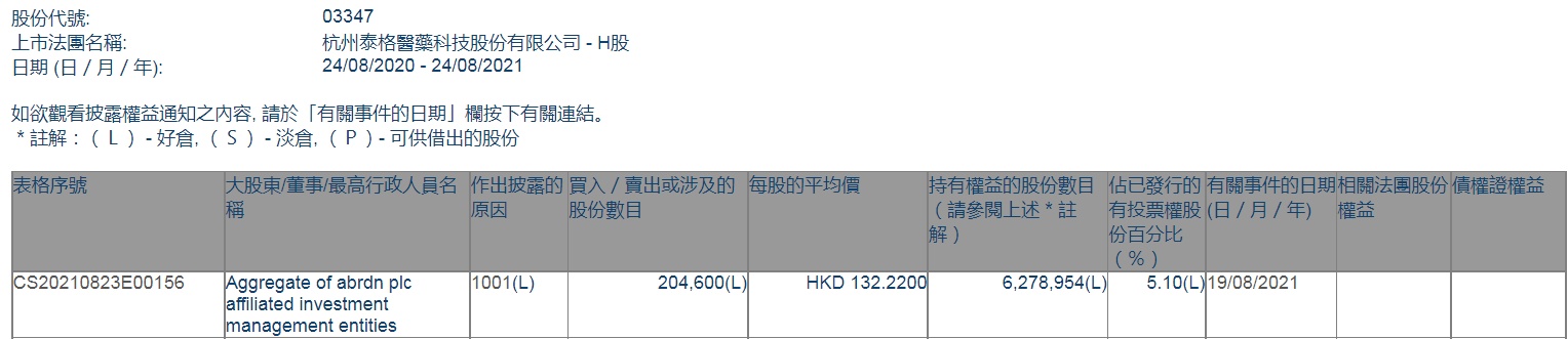 智通财经APP获悉,香港联交所最新资料显示,8月19日,Aggregate of abrdn plc affiliated investment management entities增持杭州泰格医药(03347)20.46万股,每股作价132.22港元,总金额约为2705.22万港元。增持后最新持股数目约为627.90万股,最新持股比例为5.10%。
