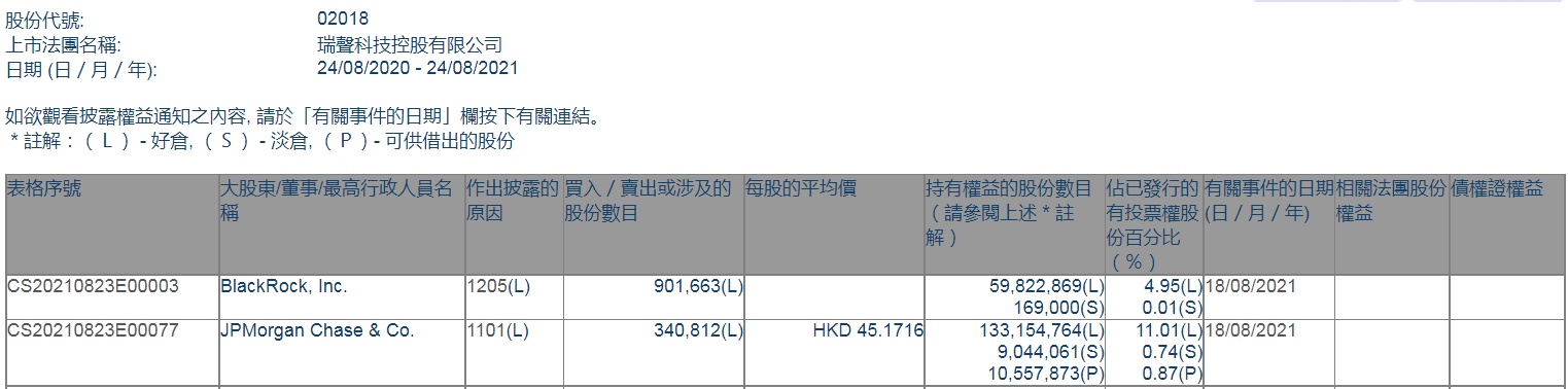 智通财经APP获悉,香港联交所最新资料显示,8月18日,小摩增持瑞声科技(02018)约34.08万股,每股作价45.1716港元,总金额约为1539.5万港元。增持后最新持股数目约为1.33亿股,最新持股比例为11.01%。