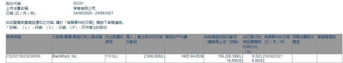 智通财经APP获悉,香港联交所最新资料显示,8月18日,BlackRock, Inc.增持李宁(02331)250.6万股,每股作价94.6536港元,总金额约为2.37亿港元。增持后最新持股数目约为1.50亿股,最新持股比例为6.02%。