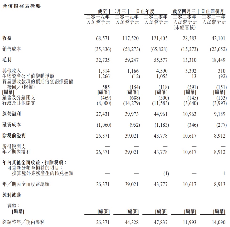 公司于2018财年、2019财年及2020财年截至十二月三十一日年度收益为6857.1万元、1.175亿元、1.21亿元;期间毛利为3273.5万元、5924.7万元、5557.7万元;纯利分别为2637.1万元、4432.8万元、4783.7万元。