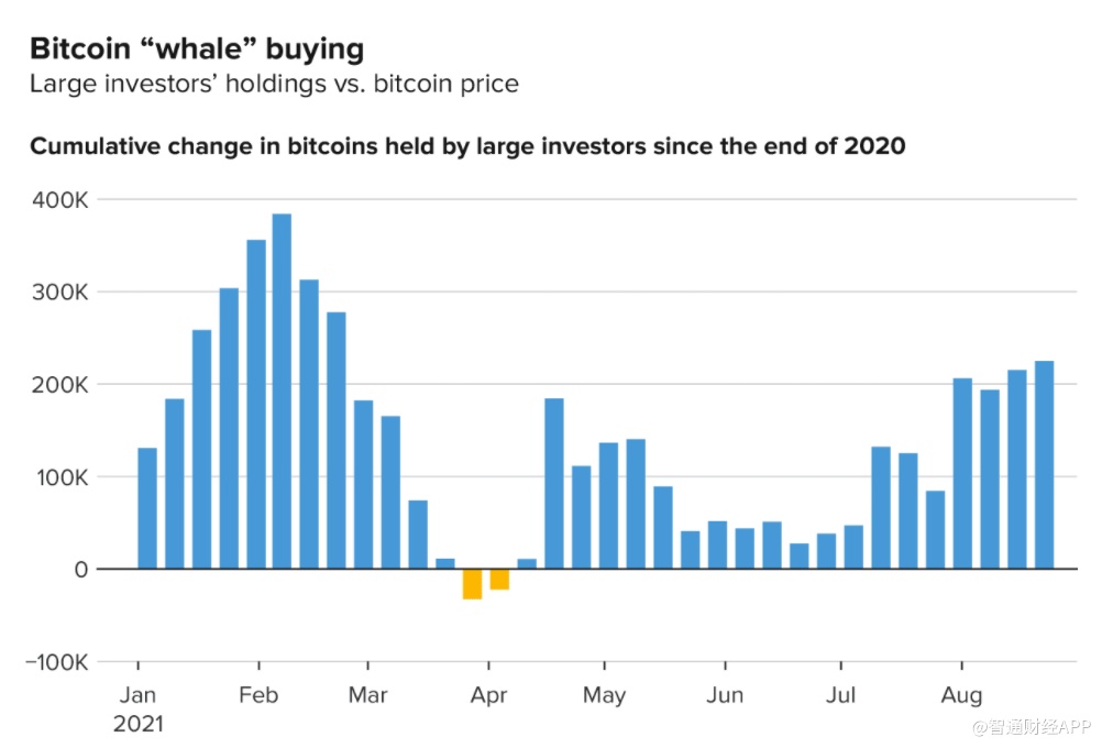 智通财经APP获悉,周二,根据区块链公司Chainalysis的最新数据,自6月底以来,持有价值约5000万美元或更多比特币的加密货币账户一直在稳步增加他们的购买量。随着比特币价格反弹到50,000美元以上,这种看涨情绪持续到8月下旬。