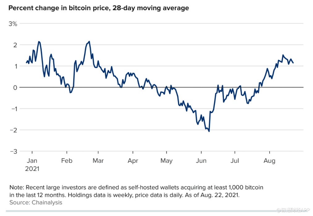 Chainalysis的首席经济学家Philip Gradwell表示:“近期大型投资者积累的比特币与比特币价格的中期变化有关。”