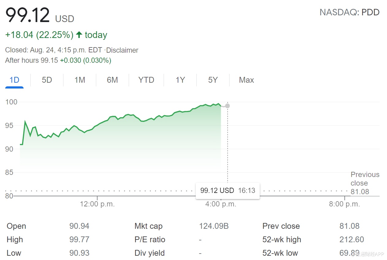 个股中,拼多多(PDD.US)收盘大涨超22%领涨中概股,股价在盘中最高触及99.77美元,创自6月底来单日最佳表现。该公司早些时候公布的财报显示,公司2021年二季度营收230亿元人民币,同比增长89%。第二季度平均月活跃用户为7.385亿,同比增30%。经调整后净利润为41.25亿元,去年同期为净亏损7720万元。截至2021年6月30日的12个月期间,活跃买家达8.5亿,同比增24%。