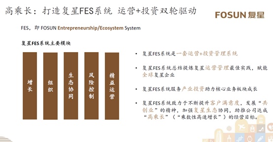 在今年中期业绩发布上,谈到“深度产业运营+产业投资”双轮驱动战略未来如何更好地落地、执行,复星国际董事长郭广昌透露,其抓手之一便是复星正在全力打造的“FES”——“我们希望通过FES这一套运营+投资管理系统,一方面做好产业投资助力核心业务板块成长,一方面总结提炼复星运营管理最佳实践,赋能全球复星企业。FES系统致力于不断提升客户满意度,发展‘共创业’的精神,加强复星生态协同,助推公司达成‘高乘长’的经营目标。”