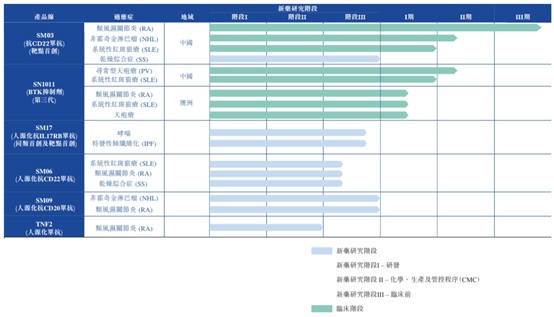 智通财经APP了解到,公司在研管线内进度最为领先的是旗舰产品SM03,该产品是全球首项用以治疗类风湿关节炎(RA)的潜在抗CD22单抗,被列入国家十三五重大新药创制专项重大项目。截至2021上半年,SM03用于治疗类风湿关节炎(RA)的III期临床试验已招募合共408名患者,预期最早于2021年年底前完成患者招募,预期SM03的商业化将于2023年下半年完成。