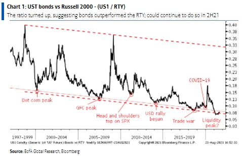 智通财经APP获悉,美债期货指数与罗素2000指数之比自3月触及创纪录的低点以来一直走高,今夏更是达到高峰。美国银行认为主要原因是市场风险偏好下行,以及不断加剧的通货膨胀使小盘股承压。大宗商品市场的情况也是类似,在过去几个月表现逊于铜和原油之后,债券市场开始出现反弹。