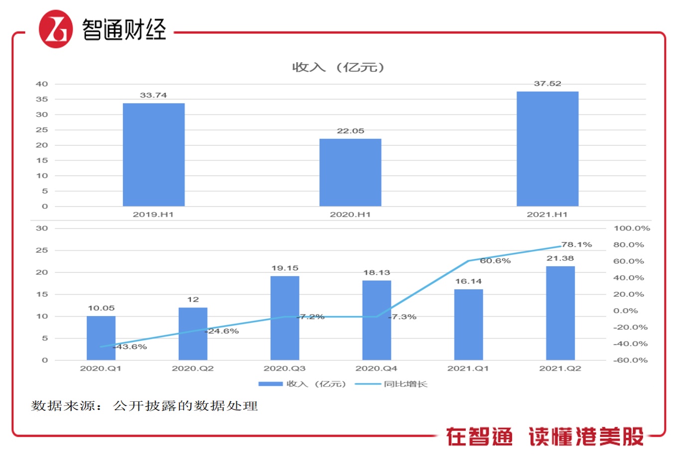 2021年上半年,该公司整体收入37.52亿元,同比增长70.1%,较2019年同期(疫情前)增长11.2%,按季度看,从去年Q1至今年Q2,业绩持续复苏,今年Q2收入突破季度历史新高。