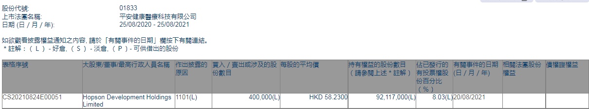 智通财经APP获悉,香港联交所最新资料显示,8月20日,Hopson Development Holdings Limited增持平安好医生(01833)40万股,每股作价58.23港元,总金额为2329.2万港元。增持后最新持股数目为9211.7万股,最新持股比例为8.03%。