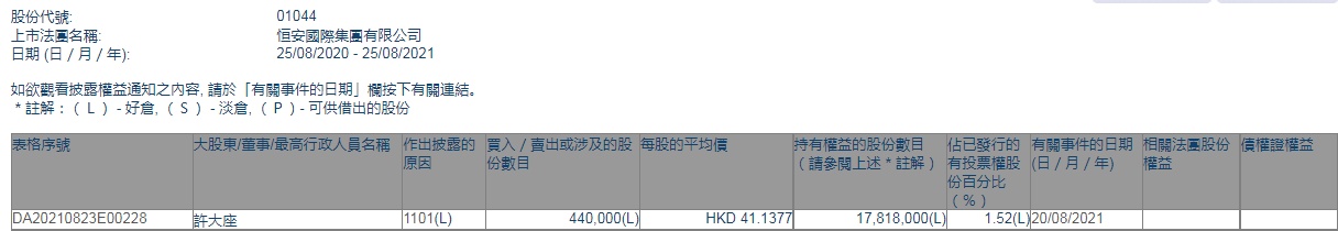 智通财经APP获悉,香港联交所最新资料显示,8月20日,执行董事许大座增持恒安国际(01044)44万股,每股作价41.1377港元,总金额约为1810.06万港元。增持后最新持股数目为1781.8万股,最新持股比例为1.52%。