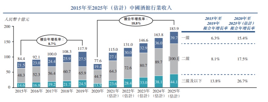 与此同时,来自酒馆行业的收入也迅速增长,预计中国的酒馆行业的收入在2025年将达到1839亿元,相比于2020年的约776亿元,年复合增长率达到18.8%。