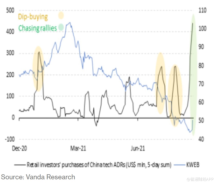 但在过去的几天里,抄底中概股的散户交易员们涌入了该板块。根据Vanda Research的数据,过去五个交易日,散户交易员净买入中概科技股的金额超过了4亿美元。