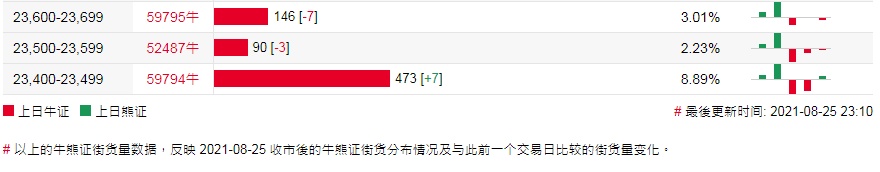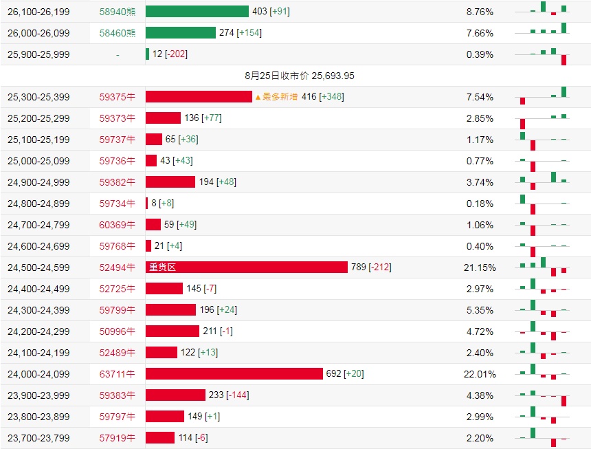 牛证街货重货区在24,500-24,599区间,该区间最新牛证数量为789张,较上一交易日减少212张;最多新增在在25,300-25,399区间,该区间最新牛证数量为416张,较上一交易日增加348张。