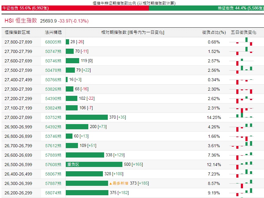 法兴恒指牛熊证街货分布图中的数据显示,熊证街货重货区在26,500-26,599区间,该区间最新熊证数量为500张,较上一交易日增加165张;最多新增在26,300-26,399区间,该区间最新熊证数量为373张,较上一交易日增加185张。