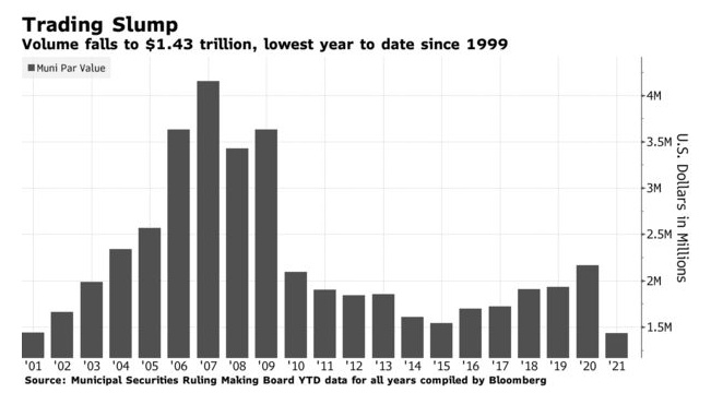 平均而言,每天约有89亿美元的市政债券在换手,这是2001年以来的最低水平。