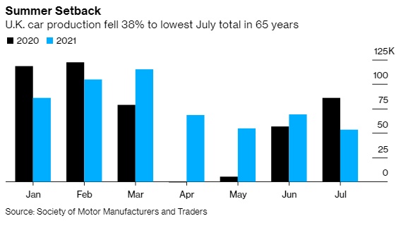 除了芯片短缺导致全球生产线产能下降外,同时英国政府加强了疫情管控措施。英国今夏新增确诊病例数量激增,于是国家卫生服务系统(NHS)启动了密切追踪者移动应用程序,对数十万人进行追踪并要求他们按照规定进行自我隔离。