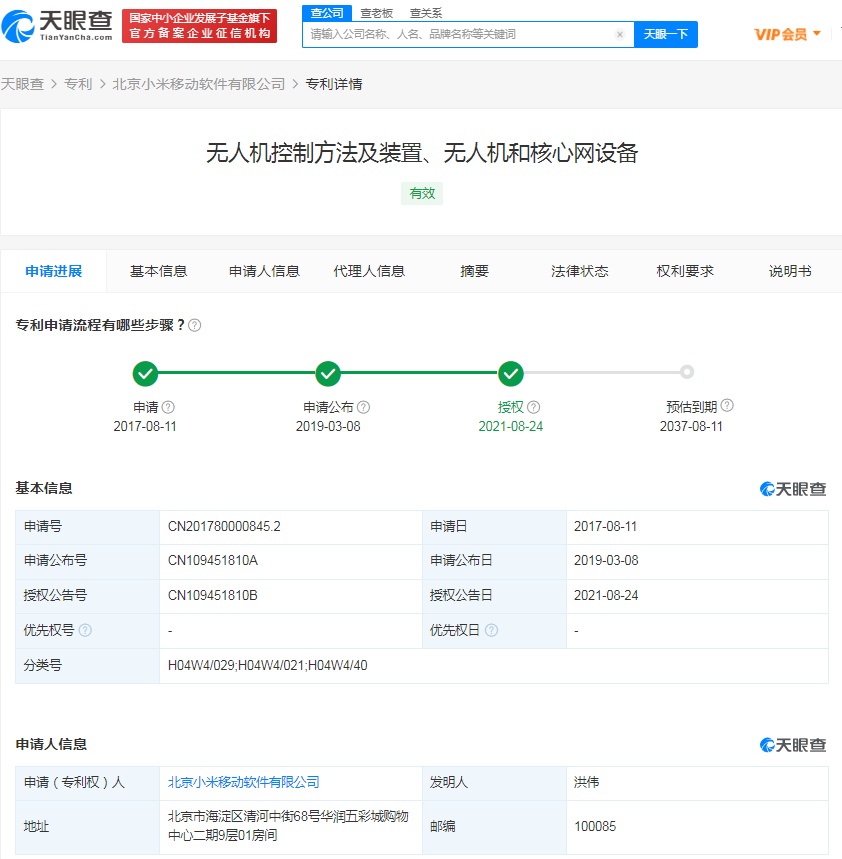 智通财经APP获悉,天眼查App显示,8月24日,北京小米移动软件有限公司“无人机控制方法及装置、无人机和核心网设备”专利获授权,公告号为CN109451810B。