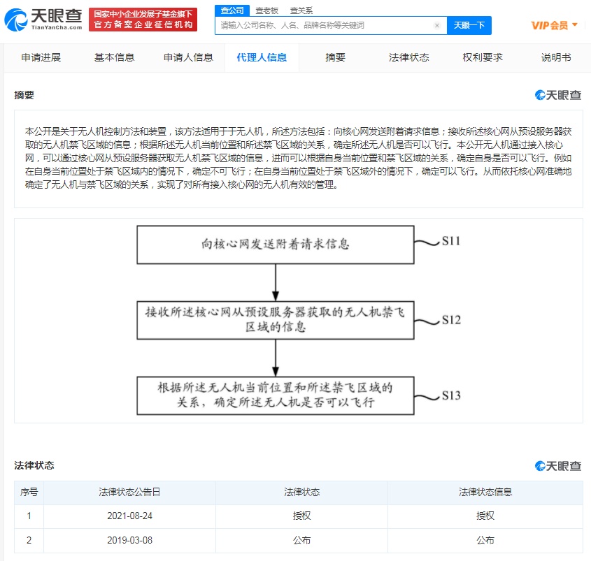 专利摘要显示,本公开无人机通过接入核心网,可以通过核心网从预设服务器获取无人机禁飞区域的信息,进而可以根据自身当前位置和禁飞区域的关系,确定自身是否可以飞行。从而依托核心网准确地确定了无人机与禁飞区域的关系,实现了对所有接入核心网的无人机有效的管理。