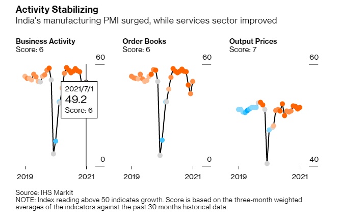 印度工厂的经理们普遍认为7月份生产活动激增。这也反映出随着疫情控制措施解除,需求回暖,订单增加。另外,一项旨在预测服务业采购经理人指数的调查显示,该指数7月的数据可能有所改善,不过仍低于50这一荣枯线。