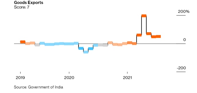 印度7月份出口同比增长49.8%。虽然这一增幅远低于4月份的196%,但涨幅的下降在很大程度上反映的是低基数效应不如前几个月明显。推动这一指标的两大主要因素分别是石油产品需求回暖和珠宝出口增长,前者出货量跃升231%,后者出口增长131%。