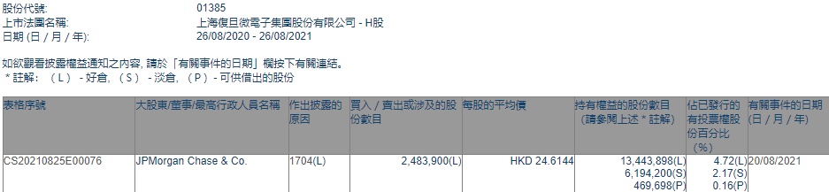 智通财经APP获悉,香港联交所最新资料显示,8月20日,小摩减持上海复旦(01385)248.39万股,每股作价24.6144港元,总金额约为6113.97万港元。减持后最新持股数目约为1344.39万股,最新持股比例为4.72%。