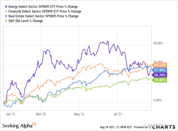 可以看到,金融行业ETF-SPDR(XLF.US)、The Real Estate Select Sector SPDR Fund(XLRE.US)、能源指数ETF-SPDR(XLE.US)上涨了27%至29%,而标准普尔500指数上涨了约19%。