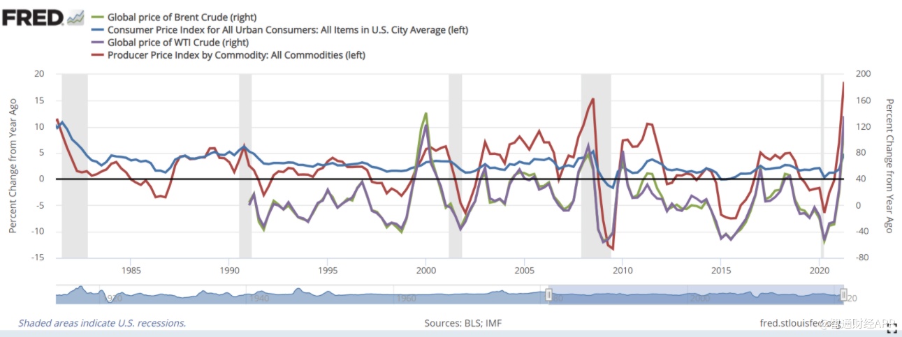 燃油价格上涨影响了许多行业,如化学、交通、能源,通常还有制造业。 从下面的表格看到,油价(灰色和绿色线)与生产者价格(红线)的关联度甚至比与消费者价格(蓝线)的关联度还要高:
